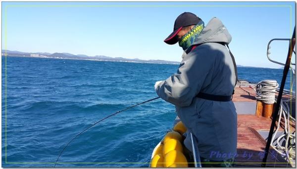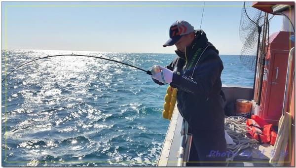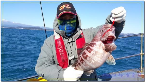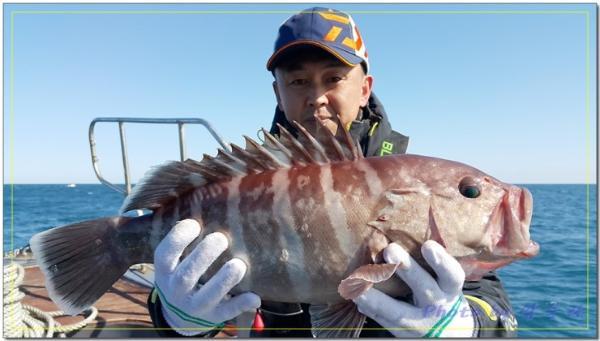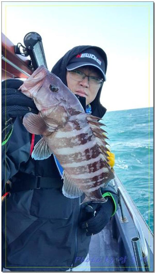 배 뒷편에서 조용히 낚시하던 조사님께 3키로급 능성어가 올라오고...